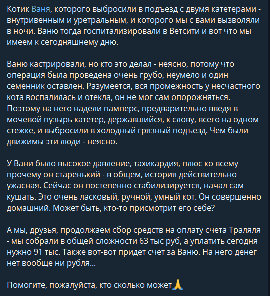 После чьей-то криворукой кастрации у кота воспалилась и отекла вся промежность, он не мог самостоятельно опорожняться, в клинике, видимо, зашли в тупик, поставили уретральный катетер (тоже криво), а семья решила, что им такие проблемы не нужны и отнесла пожилого кота в чужой подъезд. Кота с двумя катетерами (венозным и уретральным) и в памперсе сидел на голом полу, на ступенях, в холодном и грязном подъезде. Сидел смирно, где оставили. Видимо, ждал, когда за ним вернутся...