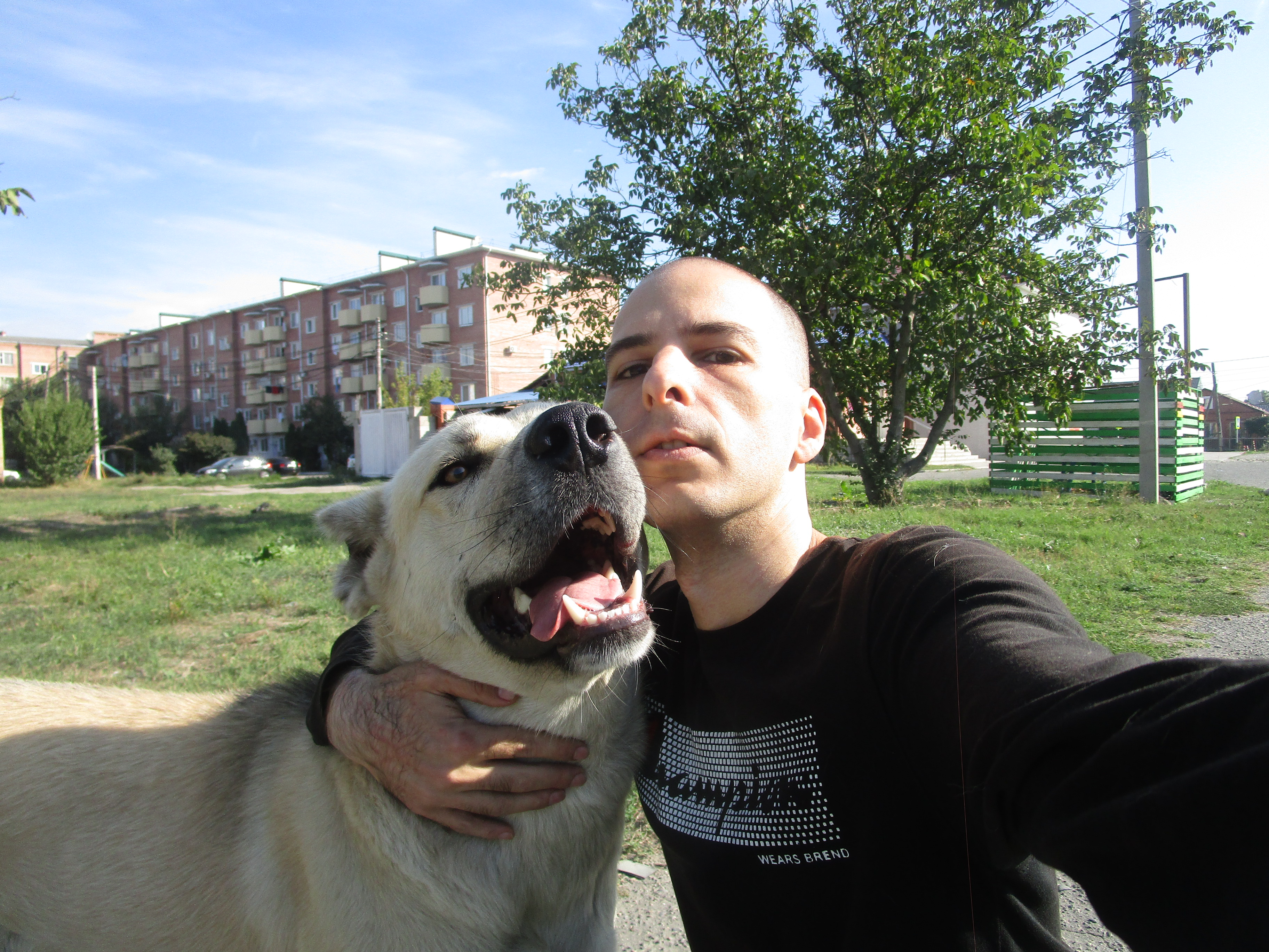 Я и алаб. Не умея или не желая рассчитывать свои силы во время игр, он неплохо потрепал меня ещё при первом знакомстве. Все последующие встречи тоже уходил от него сильно обкусаным (см. ладонь). Но всё равно очень его любил.