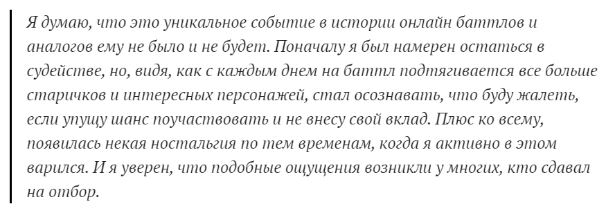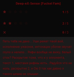Если СД пройдёт со своим рэпом 2010 годов, бэдбарсами о кальяне в жопе, баянными темами по типу Вахабита, предъявами за дружбу с Пиэмом и выпуск музыки "не там, где нужно", темой с Окси и Димастой (причём она тут не ясно), я пиздец охуею. По раскрытию хз. Я конечно понимаю, ностальгия, но надеюсь на адекватность судей. В трек СД можно имя любого оппонента подставить и ничего не изменится, хоть против него же самого юзай.. Со своими рифмами доебыватся до рифмовки Дипа, странная хуйня. У Дипа первая часть кажется слегка затянутой, но к чему говорят, что со звучанием что-то не так, не понимаю. Единственное, что порезало слух - ускорение в первой части, про Катю, с остальным все отлично.