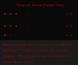 Дип - по факту сносит ... Но ппц душно .. бит один и тот же половину времени и эти лёгкие смены подачи ничего не дают, скучно стало в середине . "Дип, сделать по факту желательно так,чтобы было и приятно слушать" вторая часть "называем всех остальных ,и все .. снова монотонный бит и ты в одну калитку читаешь " .. Сд - вступления забавно,но Дикий Ди? серьезно? Я ебал твой ротик . По тексту ... Такое себе ... Рифмы не твое ,забей ... Братан ,ты своим же текстом можешь себя вынести,смени только Дип на СД и все .. сам себя хлопнул ... По оценкам по 5 балам. Дип - занудил прям жёстко - 3 ( сделать короче и по факту или также длинной но яркой , чтобы было приятно слушать ) Сд- 1 . Братан,увы ,но топай обратно в антихайп ...ну не вывозишь ты... ни по факту, ни по смыслу и слушать тебя не приятно .. (вот будем честными ,среди друзей такое я бы не включил,стыдно прям пиздец за такую хуйню!)Все хуйня,давай по новой