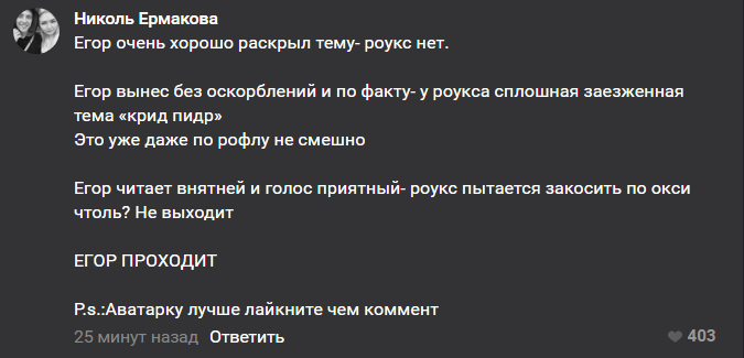 Послушал оба трека, хочу чтобы Толик прошел дальше где его повозят дерьмом по ебалу хлеще чем в этом раунде. Это тебе не комплиментарки в петушиной лиге
