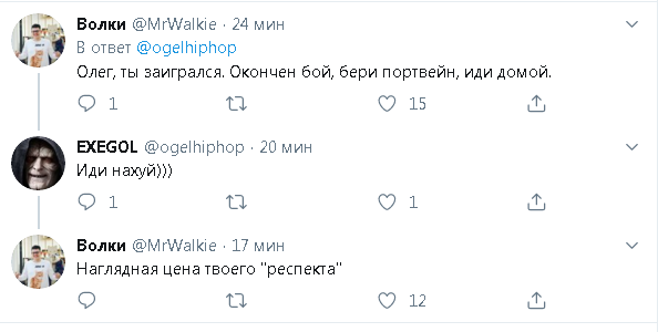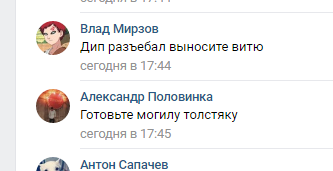 Угрозы я от тебя слышу уже 2 года. Виделся я с тобой, получается уже три раза. Вплотную. И до баттла, и на баттле и после общался. И вот на этот раз, ты перешёл все видимые и невидимые границы. Разговаривать с тобой неадекватом дальше - самое бесполезное занятие которое только можно представить. А посему, обращаюсь в последний раз. Я думаю что до тебя этот текст дойдёт, так или иначе ( даже несмотря на твой выпил с вк ). Если ты так долго, пытаешься меня запугать - то это безуспешно. Увижу я тебя ещё раз, где угодно, когда угодно и ты включишь быка или тем более попытаешься что то сделать - я буду готов. Как и всегда был. Я думаю ты меня понял. А там, будь что будет. Родаков я предупредил, ситуацию обрисовал. Ибо с такими угрозами родителям и в такой ситуации не шутят. Кое как отговорил их идти к знакомым и решать этот вопрос радикально, но это пока. Пока ничего не произошло. Это я не считаю, что за слова нужно что то делать. Даже за такую мерзость. А они немного другого мировозрения. В общем, они тоже готовы. Если ты вдруг подумал, что ты "бессмертный", и тебе ничего не будет, за тебя всё порешают и т.д - ты очень глубоко заблуждаешься. Я тебя предупредил.