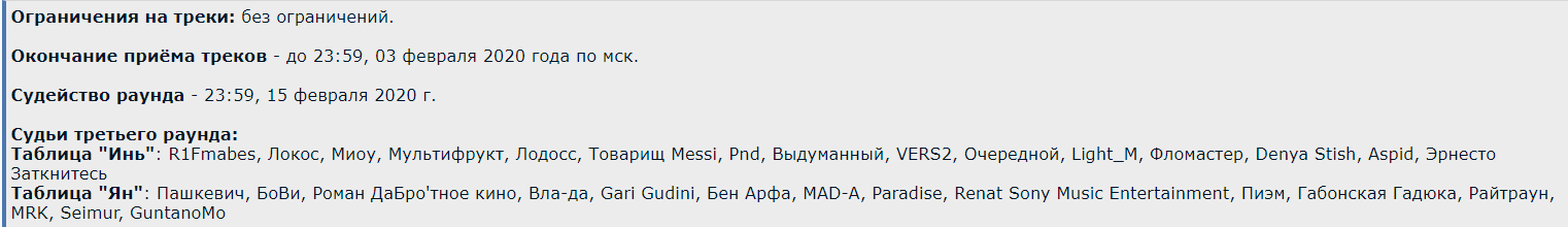 4. Во время судейства важно оценивать трек исполнителя без учета его бэкграунда, прошлых заслуг и перспектив в дальнейшем, оценивая исключительно представленный трек на конкретный раунд, а также важно исключить личное отношение к исполнителю, симпатию или негативное отношение к его поступкам, трекам и любым другим факторам, не относящимся к оцениванию трека на раунд.
