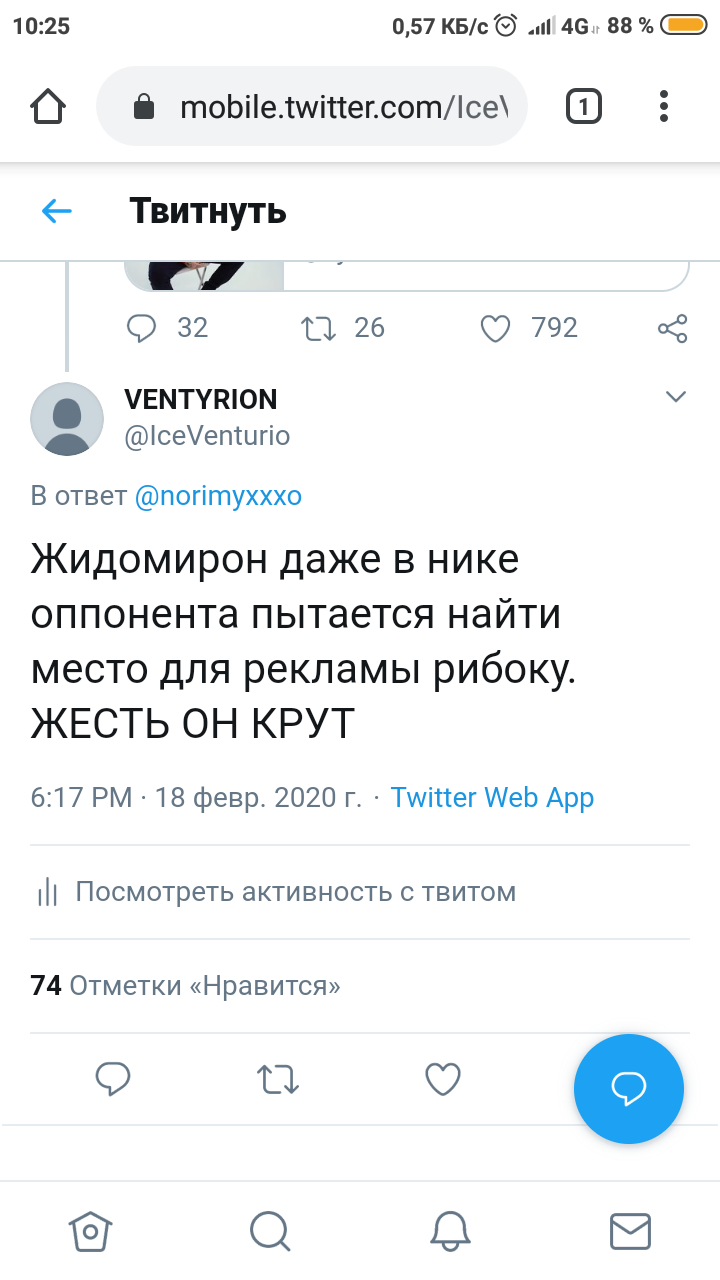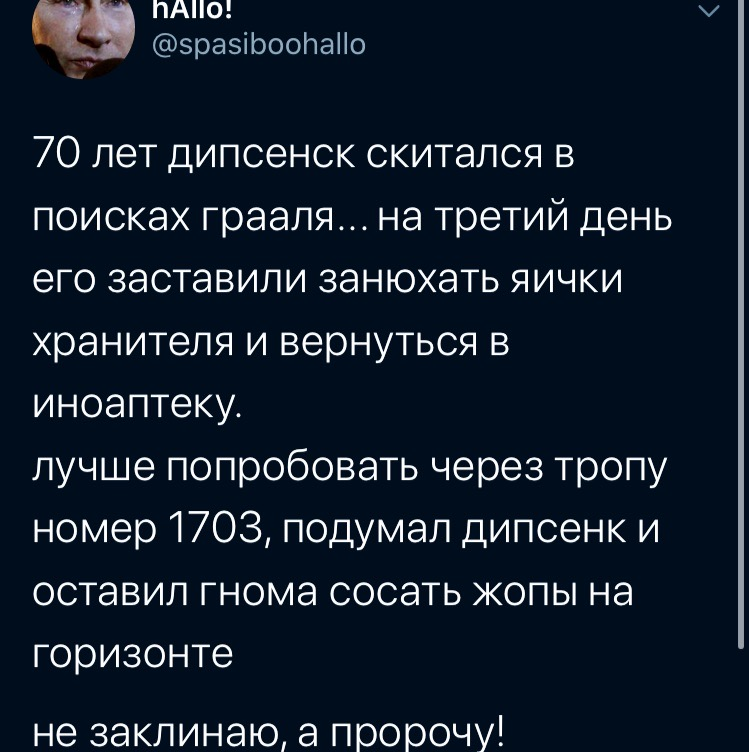 >>199333 Лучник пока не попал в пару с Мироном, ну и разъебывать его такой темой гораздо выгодней, чем перечитывать горгород, лещи,лсп,тв и т.д. все уже пошутили на эту тему >>199335 Тогда он и Пожарским тусовал и про нбп писал, но ЯСЧИТАЮ, что это был такой лолкек троллинг)))0) от Мирохи и не больше, а сам он левый судя по всем твитам