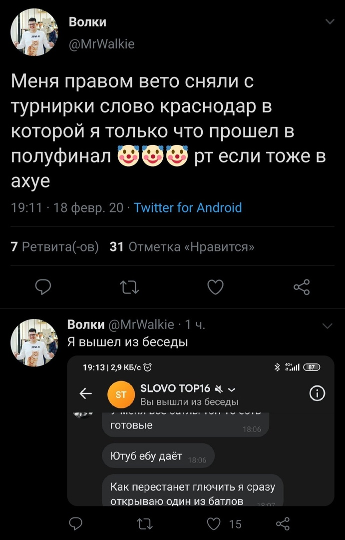 Жду уже год ебаное #slovochmerserka по дебатам, а он какой-то джангл в будках записывает. Кароче тот 4 часовой стрим походу был лучшим, что он смог. Многие пришли тупо на халяву выпить пива да пожрать, а так по факту никто не собирался там возрождать СЛОВОСПБ или еще че-то. Пиздец..