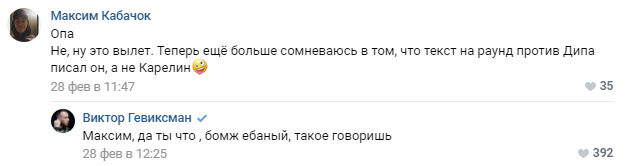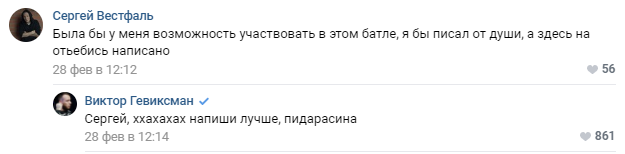 "Шикарнейший батл, просто пиздатый. Единственный баттл 2 на 2, который не скатился в полный бэдбарс. И да, Керамбит взял реванш над Пиэмом, примерно 65 на 35"