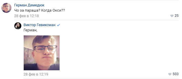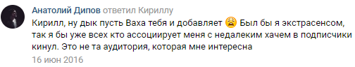 >>202384 ГОУ отнимем у Вики сиди галочку ещё и в ВК! Найдите эти комменты и пожалуйтесь на них, выбрав пункт "оскорбления" Модеры ВК быстро снимут с сиди галочку за неподобающее "звезде контакта" поведение, как в свое время галочку сняли с шокка, за то что он так же срался в комментах рипа как ребенок