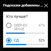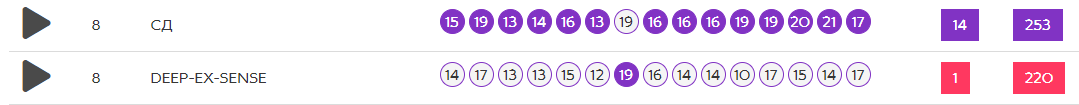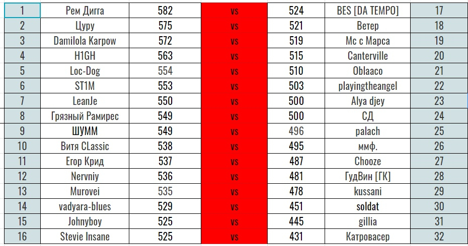 Комментарий: Очень сложная пара, два разных ,но одинаково агрессивно настроенных МЦ. Тема раскрыта и там и там практически в одном ключе. У СД на мой взгляд больше ярких строчек, но у Дипа местами сильнее зарифмовано. Если рассматривать уникальность звучания, то СД явно выглядит убедительней, очень жаль что в этом пункте есть лишь 3 оценки - 0,1,3, потому что у СД твердая 3, но и у Дипа явно не 1, но к сожалению приходится исходит из того что дали. Очень сильная пара, но победа, на мой взгляд за СД