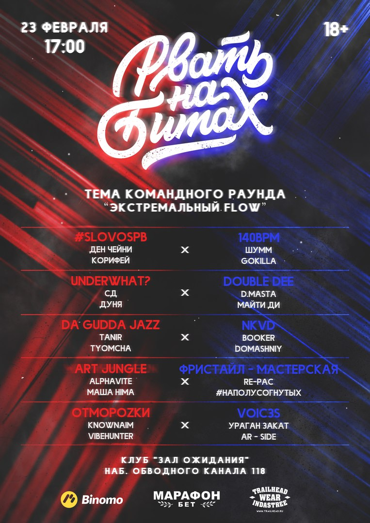 19 апреля - Рвать на битах: БЕЗ ПАНИКИ x 2ТИПА 26 апреля - Рвать на битах: НИЩЕТА И СОБАКИ x BLOCK CREW 3 мая - Рвать на битах: MNRX x TOP FLOW 10 мая - Рвать на битах: МАША HIMA x ЮЛЯ KIWI