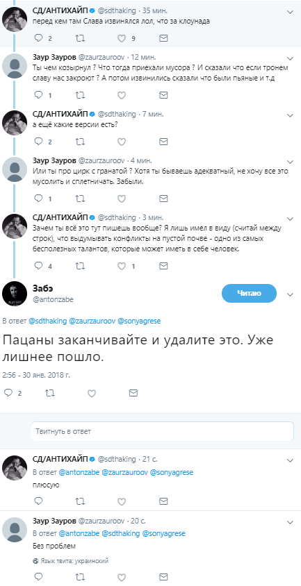 >>41475 Не, он как минимум с СД рамсил в реале, там фигурировала какая-то граната и сд мусорнулся. Мб это перед тем концертом было, ибо заур угрожал до этого и сд и гнойному в твиттере за какой-то пиздёжь А забэ в итоге слился, видать соня нужные связи подняла