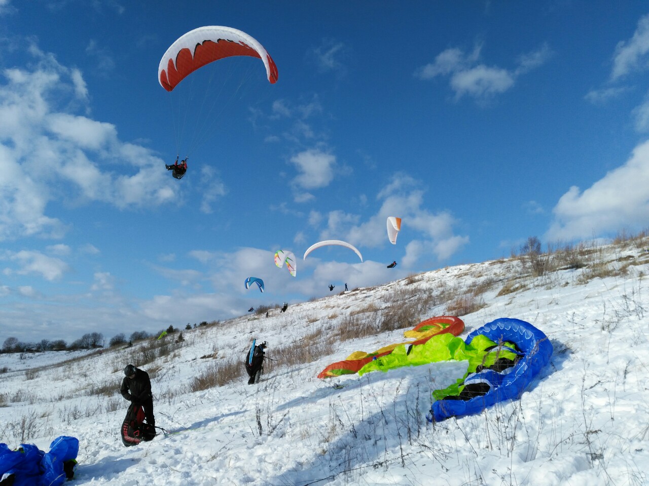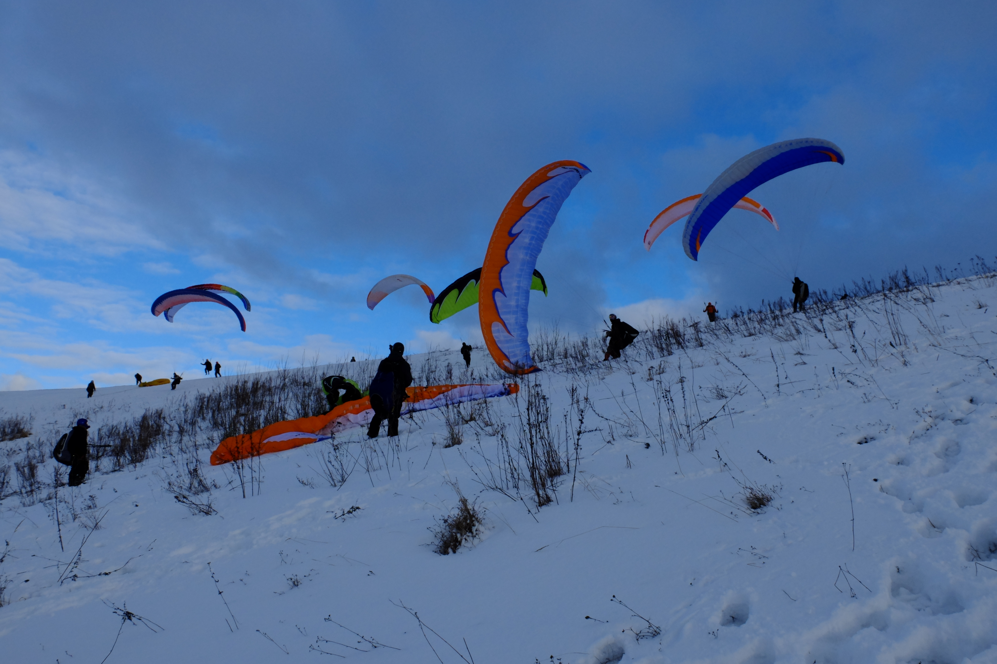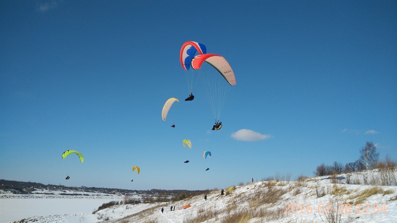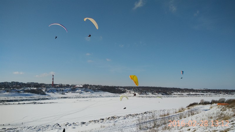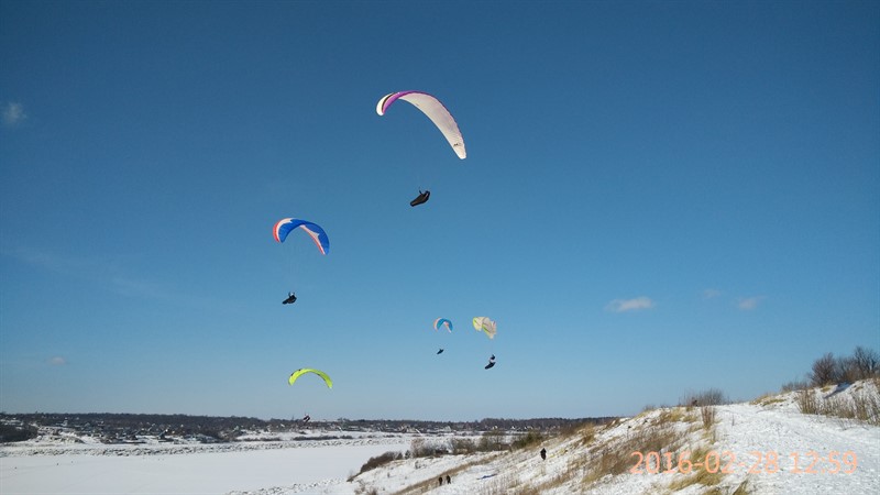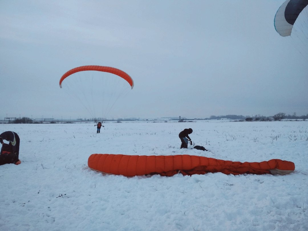 Здравствуй, мой личный бложик. Продолжаю свое обучение. Ебучий ветер в ДС2 все никак не хочет развернуться в нужную сторону и дать полетать с горки. Поэтому снова ездил в поле наземить. Народ вернулся с выходных, ездили большой толпой. По колено в снегу бегать все так же тяжко. Но в итоге ветерок поднялся и я даже смог пройти маршрут-змейку, в отличие от других учеников. Впрочем это скорее заслуга моего крыла - у меня-то оно новое, мое собственное, а им выдали убитые клубные старые, которые хрен поднимешь.