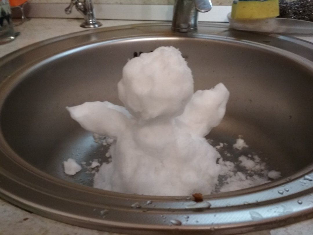 Слепил снеговика в раковине из вытащенного из крыла снега.