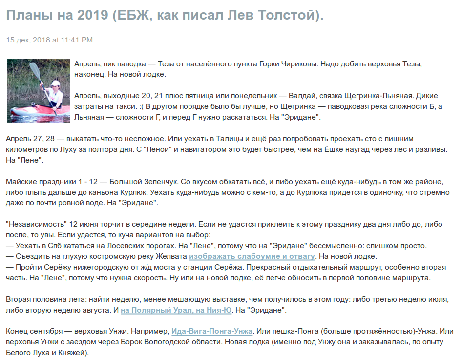 >>60156 Ну я гарантированно поеду на весенний водный рогейн в лен области. Это 18-19 мая. Плюс до этого надо будет разок другой опробовать новый вектор на воде. Ну и короче все остальные марафончики гоночки и тд, которые у нас тут в питере и вокруг проводятся, может пару раз в новгородскую область мотнусь, как в прошлом году. А так еще думаю с приозерска до лосева фигануть, там что-то порядка 70 км - если нас двое поедет, то хочу за день управиться, а если наберется несколько байдарок, то наверно на пару дней придется растянуть. Я бы на самом деле уже в ближайшее время с удовольствием где-нибудь погреб.