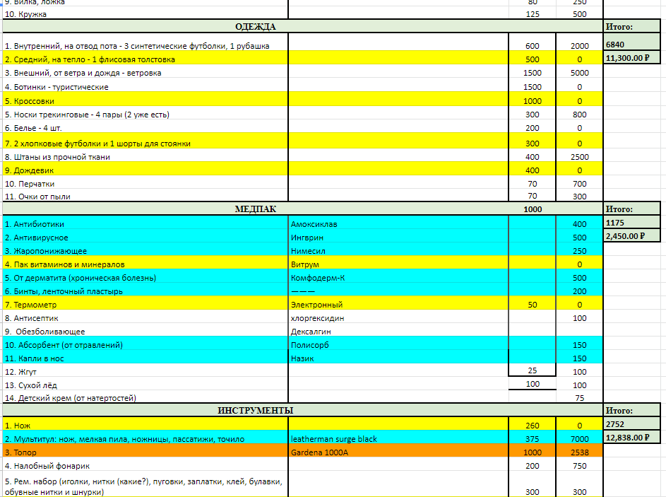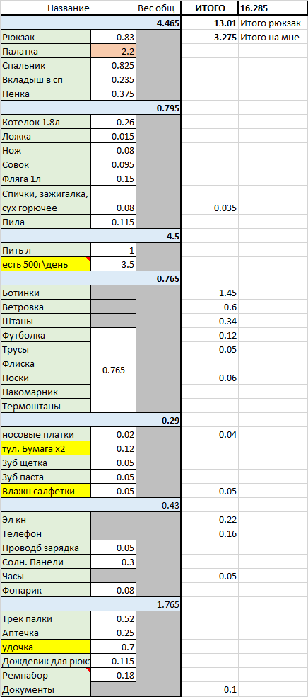 >>90083 палатку не стал менять на 1.5кг одноместку, т.к. пока не успел купить ОООП, а без него побаиваюсь показывать, что я один. желтым все, что докупить.
