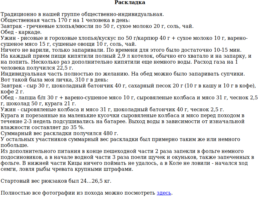 Еда. Сплавовская тушёнка и ролтоны - основа рациона. По утрам - овсянка. Чай пакетированный. Можно вместо ролтонов взять гречку, но её готовить дольше. Приправы дадут разнообразие вкусов.