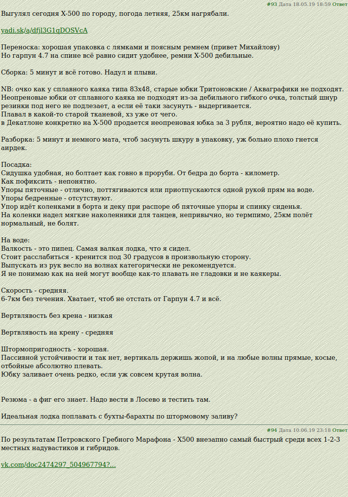 >>70180 >похвастайтесь своими плавсредствами Хвастаюсь викингом 4,7 >кратко опишите - что нравится Нравится что он значительно легче и компактнее остальных гибридов, нравится его продольная жесткость, нравятся немногочисленные элементы каркаса, представленные только двумя штевнями, монокильсоном и одним шпангоутом, которые можно убирать на мелких/шкуродерных участках. Нравится его остойчивость, которая позволяет крепить на деке груз за кучу металлических полуколец. Нравятся нормальные клапаны вместо торчащих патрубков. Нравятся нормальные надувные сиденья и регулируемые спинки вместо висящей мокрой тряпочки или лежащего на дне рюкзака. Нравится дека и юбки, сидеть по пояс в сухости и тепле, когда снаружи мерзкая слякоть/собачий холод/валы перехлестывают деку это просто оргазмическое удовольствие. >не нравится Мало места для матроса, некуда поставить ноги. Неразборные обручи неудобны при транспортировке, но это не только баг, но и фича. Для летнего сплава с семьей лучше опендек, но пока и так сойдёт. Парусит на открытой воде, за счет большой ширины не слишком быстр. >при возможности на что бы поменяли Поменять на тайгу/гарпун/маринку/щуку/каркас пока желания не возникало. Когда выбирал байдарку, нарисовал большую сравительную таблицу с другими 2-3 местными лодками, поэтому точно знал, что я беру и для чего. Компромисс из компромиссов, как вся моя снаряга, но компромисс разумный. поменял бы работу, но это уже совсем другая история