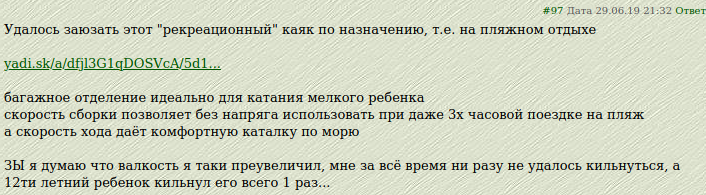 >>68618 (OP) Решил вот собрать для ребенка лодку поиграть. Вторая ножная помпа за два года, у обеих одинаковая поломка - лопнула возвратная пружина кручения. Если продолжать пользоваться с помощью шнурочка, рано или поздно свободный фрагмент пружины проткнет мех изнутри. Первая шла в комплекте с викингом, сломалась через год. Вторая куплена в местном рыболовном магазине, сломалась через год. Хранились обе в расправленном виде. У кого такие же - будьте готовы к неожиданностям прямо на берегу. При этом лучше 3л ножной помпы с функцией отсоса и вдувания я ничего не знаю и знать не хочу. Цена, вес, объем, усилие и быстрота накачивания - в ней всё прекрасно. Когда целый день пиздякаешься на заброске, потом по-пырому собираешь свою лохань и хочешь еще сколько-то пройти перед вечерними сумерками, дрочить ручной насос дрожащими от усталости руками вообще неохота. Чем пользуется сплавщики ИТТ?