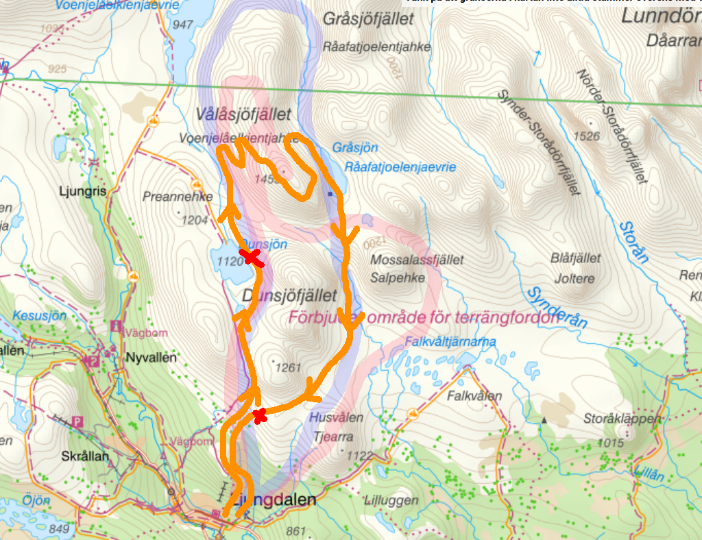 Вот примерно так я ходил. Красная полоса — Кунгследен, зелёная — мой план, фиолетовая — то, что я на деле прошёл. Чёрным обозначены места ночёвок.