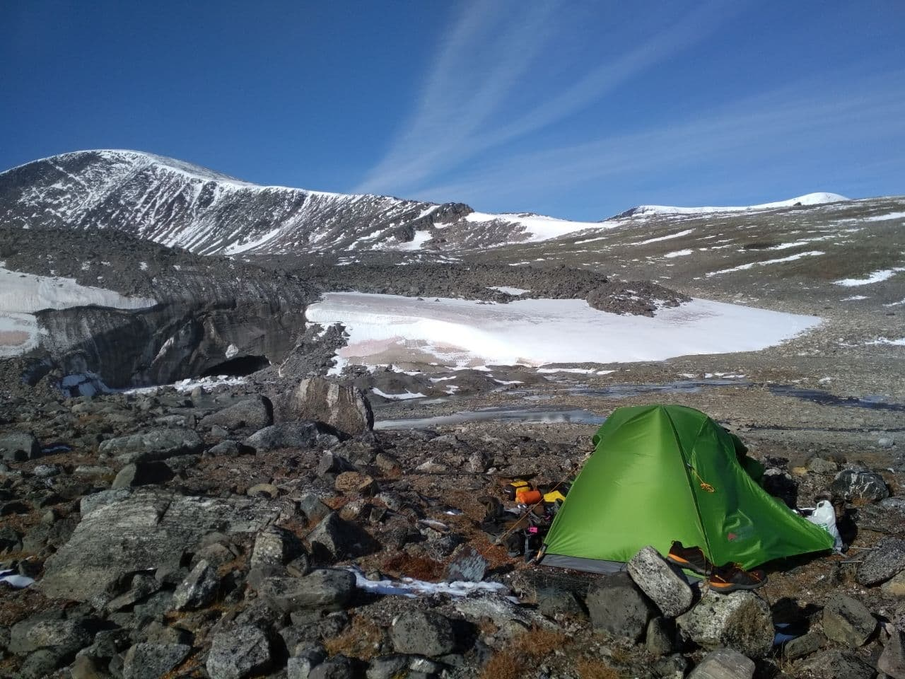 > Как вообще шлось? как настроение? До Тарфалы всё было отлично. Подъём после Тарфалы под дождём был как тренировка в сауне — потно, но ничего дикого. Когда решал, куда дальше идти, было стрессово, особенно стоя рядом с трупом. Потом, когда спускался по ущелью, бывало тоскливо от того, что людей в довольно большом радиусе нет, и что меня там могут не найти в случае чего. Потом мне составило компанию стадо оленей. Они были ниже меня и каждый раз, когда я приближался, они перебегали чуть ниже по тропинке. Кстати, они там вдоль и поперёк наследили по снегу, поэтому проходящую там старую человеческую тропинку было трудно искать (вблизи её можно узнать по дыркам от трекинговых палок). Были неприятные моменты, когда шёл по снежным склонам — некоторые из этих сугробов подмывались снизу ручьями, как бы не провалиться. Но всё было нормально, проваливался пару раз и только у краёв, где начинаются камни.