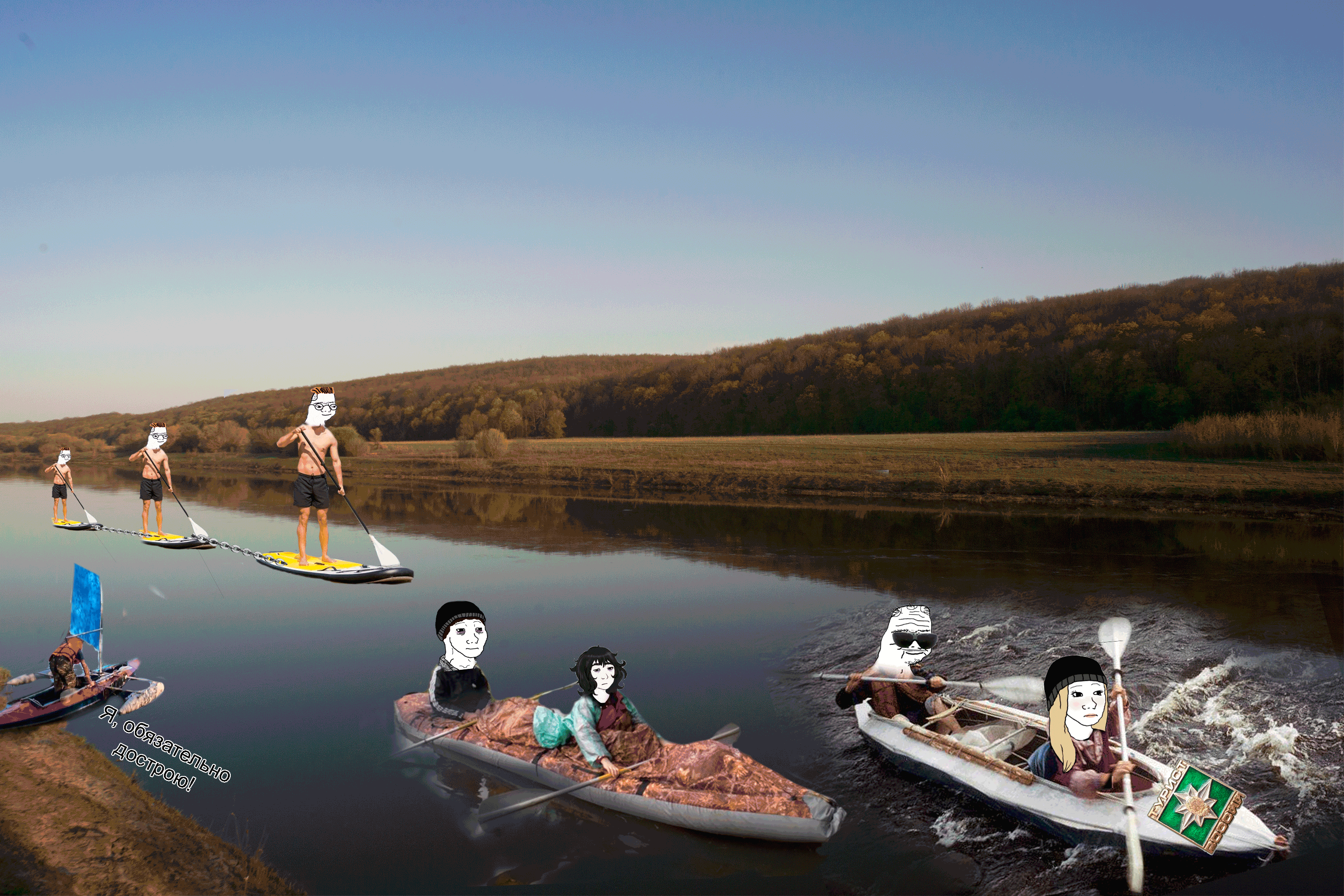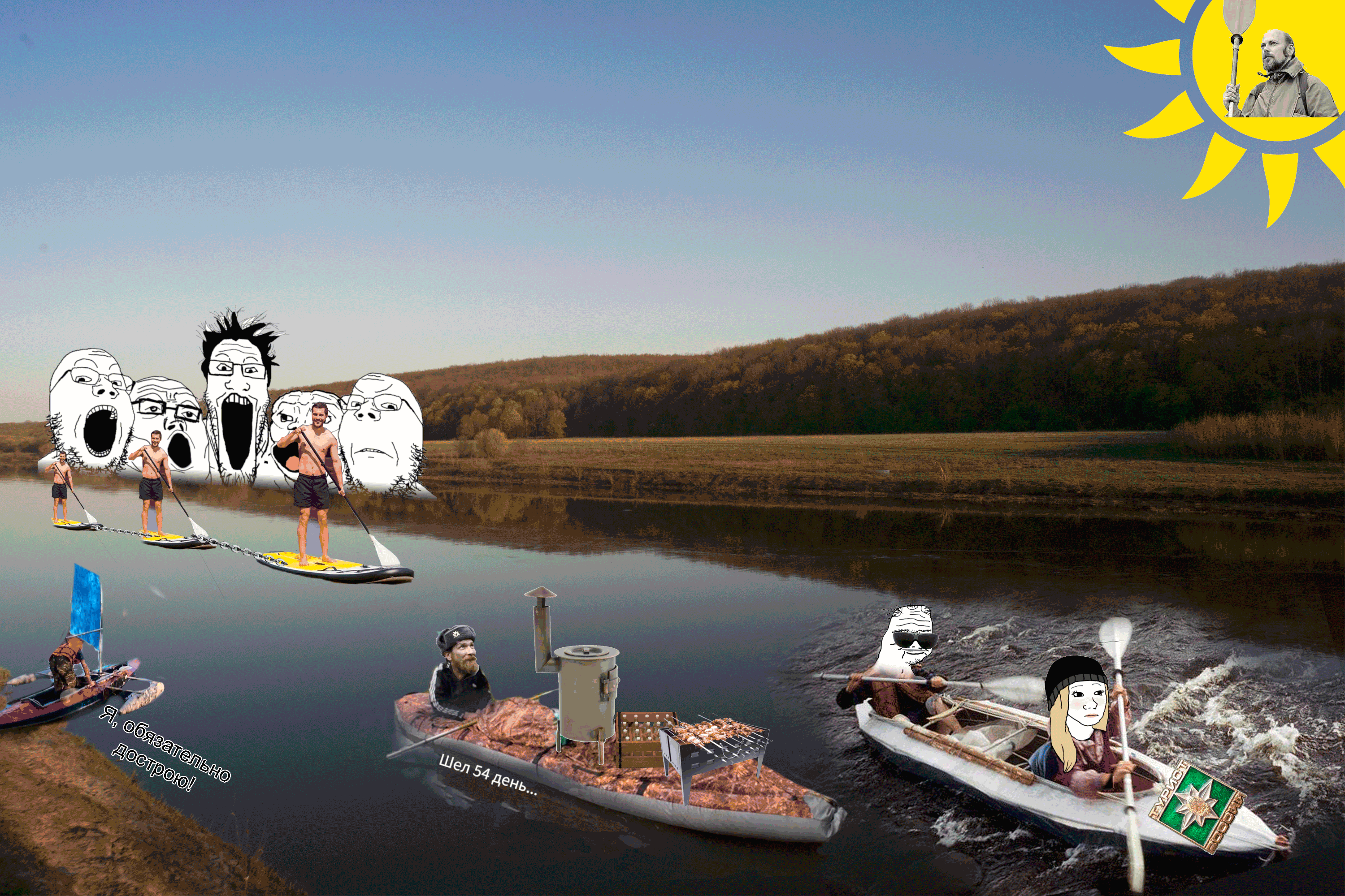 Перестань ты уже кривляться и пиздеть, все началось со слов которые звучали примерно как посоны пойду в поход на сапе, думаю за 5 дней 400км сделать, потом было что то вроде сделал тестовый выход, проплыл 5км и заебался