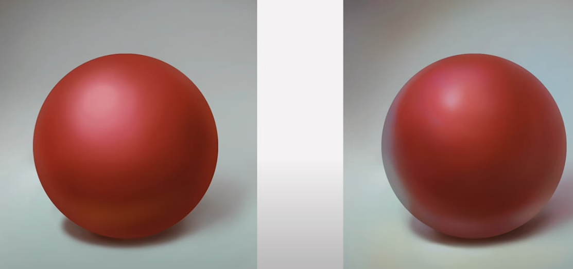 Прост анон неправильные слова использует. Не размываться а светлеть. И не под сферой а чутка от нее. Прямо под сферой у нас оклюжн, там темно должно быть. А чуть рядом тень на поверхности будет светлее, потому что от сферы отражается свет. Всё это, конечно, работает только при определенном освещении и тоне поверхности.