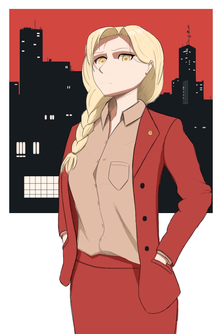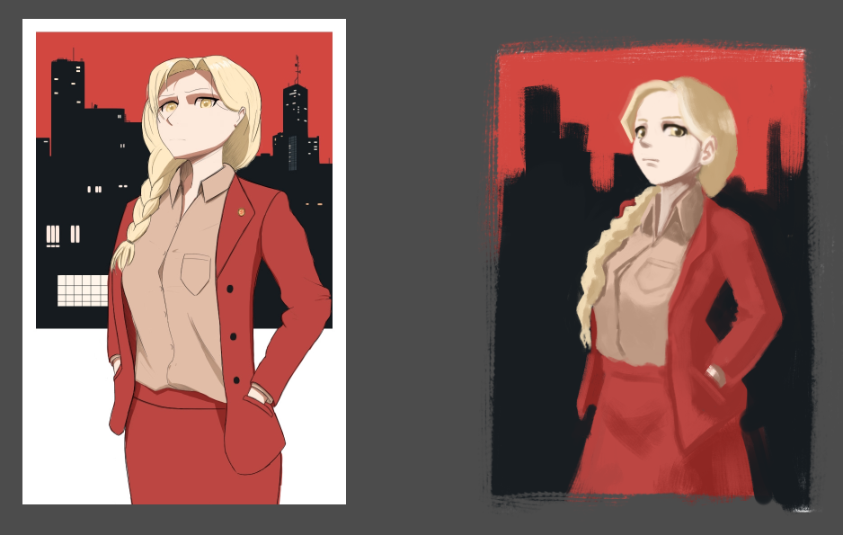 >>893163 Типо композиция. Персонаж занимает центральную треть, разделяя левую и правую. Фон занимает верхнюю 1/2 - 2/3. Красная юбка с красным пиджаком занимают нижние центральные 2/3, 1/3 центра верха занимает голова. Рубашка ровно по центру, разбивает красный цвет. Город прерывает красное небо и создает линию на уровне головы, получается точка фокуса на лице. Окна размешивают монотонный черный.