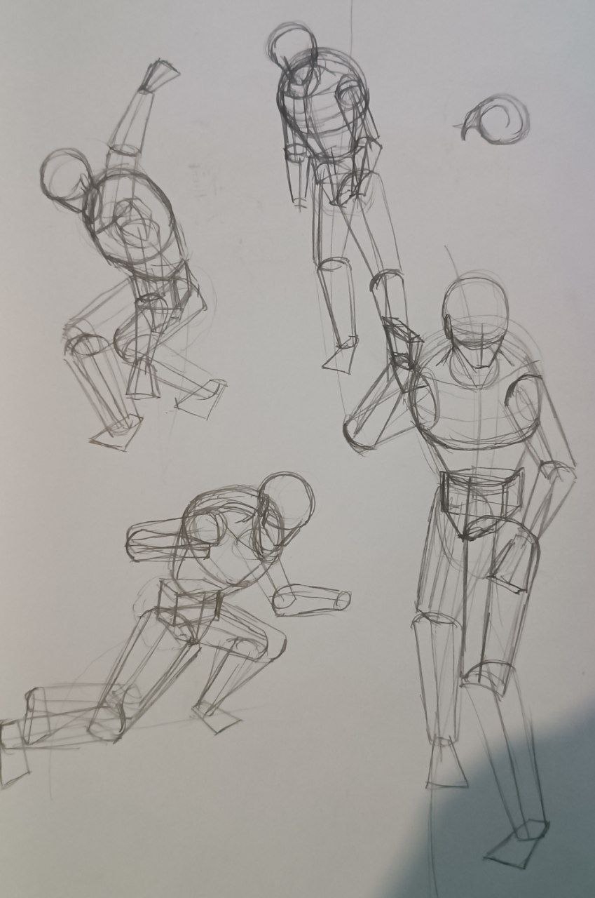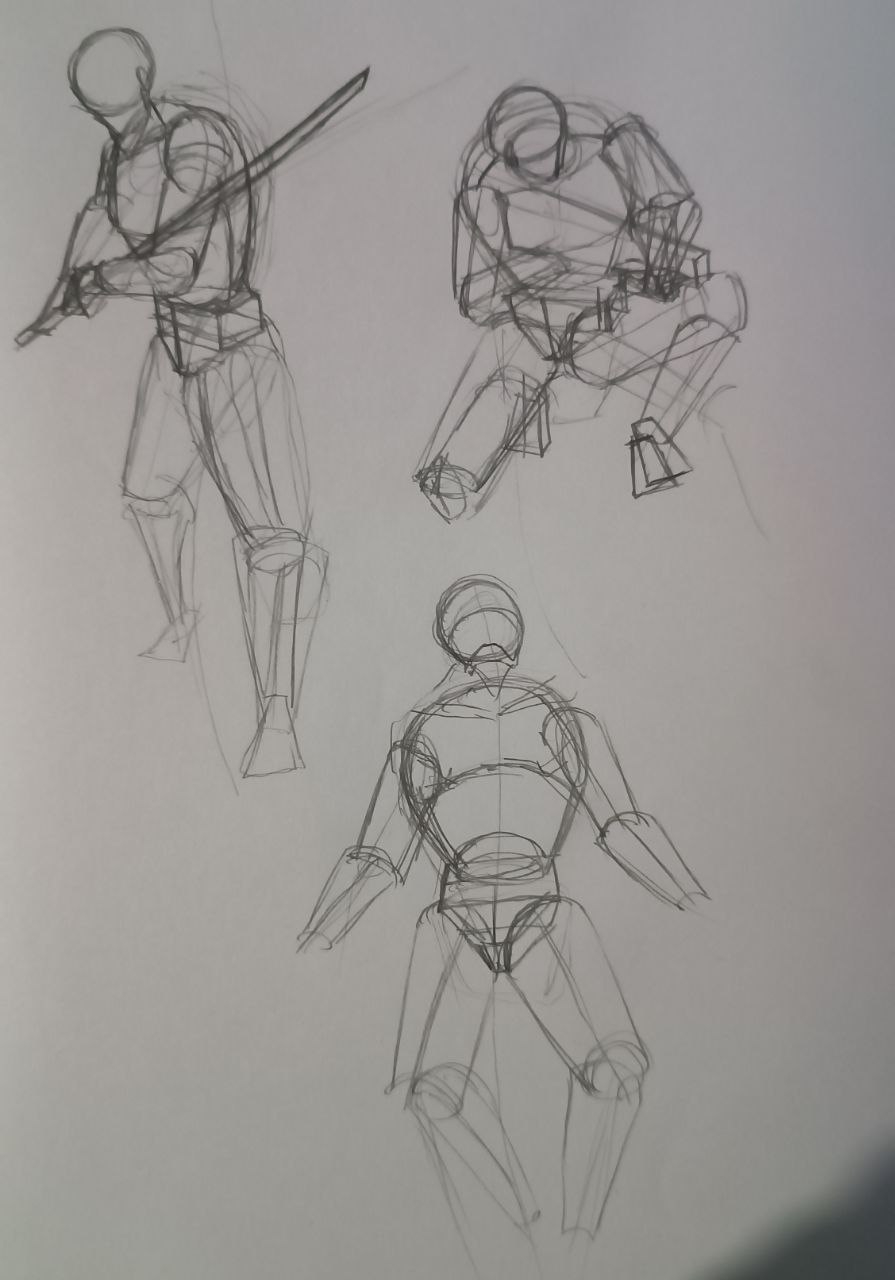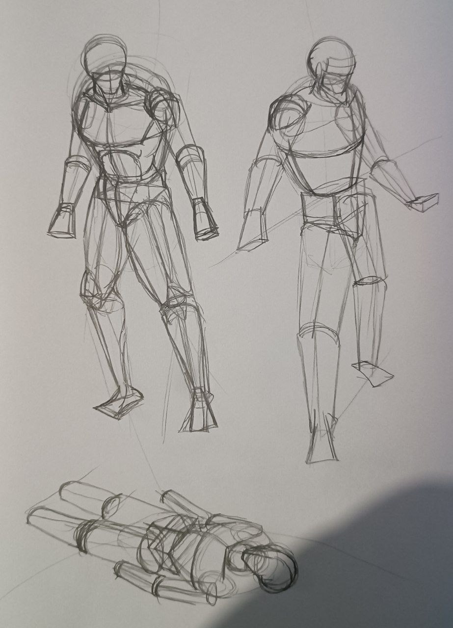 вечером: надо повторить принцип построения из книги Дэвида Росса. надо обратить внимание на пропорции манекенов. надо обратить внимание на поворот манекена в пространстве. мышцы пока не прорисовывать.