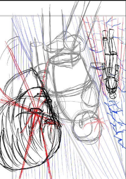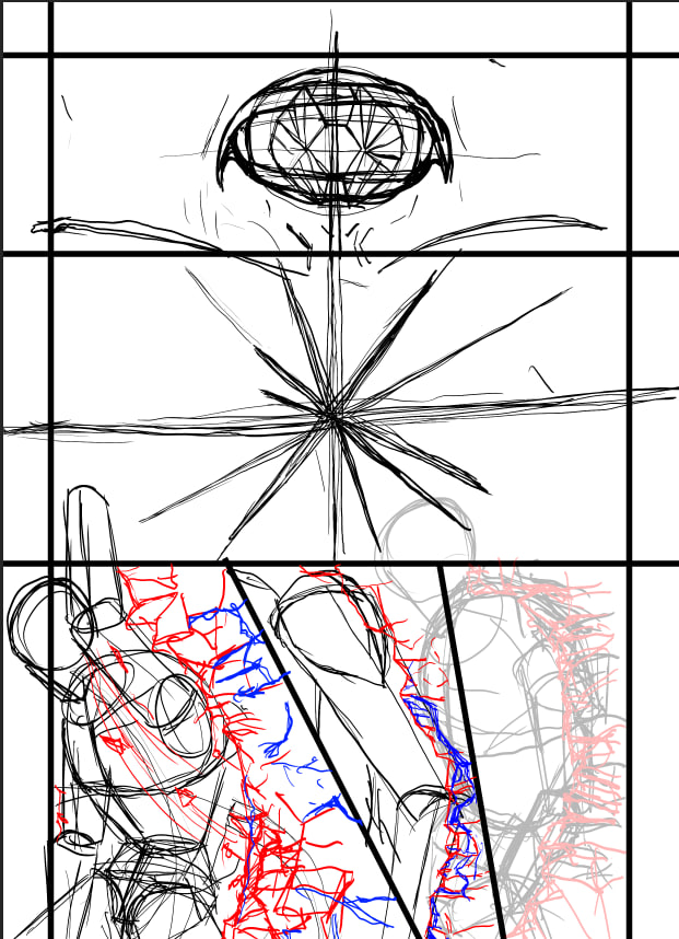 к разворотам подхожу с точки зрения акцентов скорее. эта манга это по сути ещё одна проба пера с чуть апнутым скиллом, поэтому тут пока наугад и по наитию. то есть разворот это как удар по ебалу, когда обычные страницы и фреймы - сетап и навязывание ритма.
