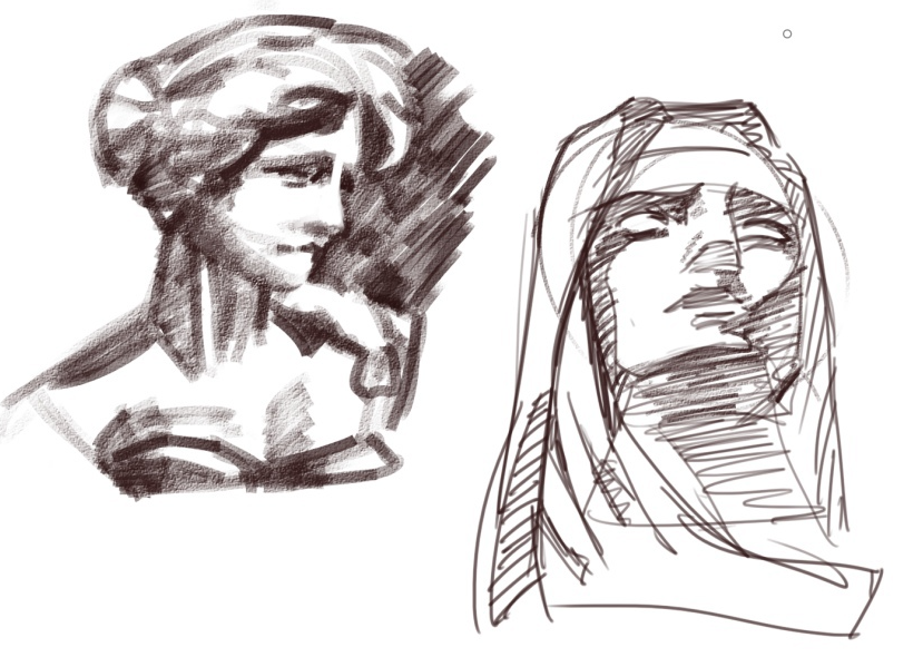 Так уныло без препода искать инфу самому. Например вот если скетчишь здания там и природу то вроде нужно не делать прямые быстрые линии, а делать медленные и кривие, тогда будет красиво типа. И я это узнал из видео с ютуба. А до этого рисовал прямые и думал че получается так некрасиво. А сколько еще такого я не знаю.
