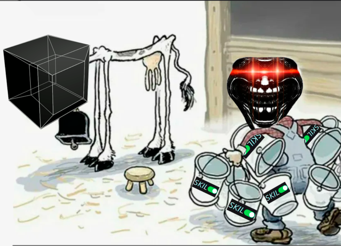 Если что, разница в рисовании кубов 4/10 и 10/10 - это не 250% улучшение, а примерно 1000-2000% из-за нелинейности в разнице между десятью условными рангами скилла. 1/10 - это порвать бумажный лист двумя руками , а 10/10 - это порвать металлическую пластину такой же ширины и высоты, но которая толще в 5 раз.