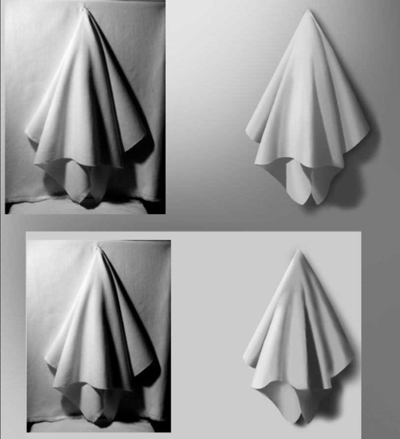 >>925145 В целом получилось хорошо, просто будь внимательнее. На пик1 у тебя на центральной складке потерялся контраст: пропустил терминатор на собственной тени и не разделил падающую тень и оклюжн(они у тебя одним тоном). Складка правее у тебя нарисована как небольшая неровность, на рефе же там глубокая складка с падающей тенью. Падающую тень справа вообще пропустил, сделал только оклюжн, там же пропустил терминатор и рассеяный свет. Снизу довольно жесткие тени сделал мягкими.