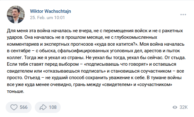 >Что Вахштайн думает по поводу задержания ректора Шанинки? Если за ним самим придут, он будет продолжать говорить, что наука вне политики и что он не имеет права высказывать никакие политические утверждения? Может он даже пытаться защитаться не будет и молча стоически сядет в тюрьму? Вообще, круто и последовательно будет Не стал дожидаться и свалил. Интересно наблюдать за исполнителем социальной роли веберовского ученого в экстренных обстоятельствах, классный социологический эксперимент правительство устроило (а говорят что не поддерживают науку)