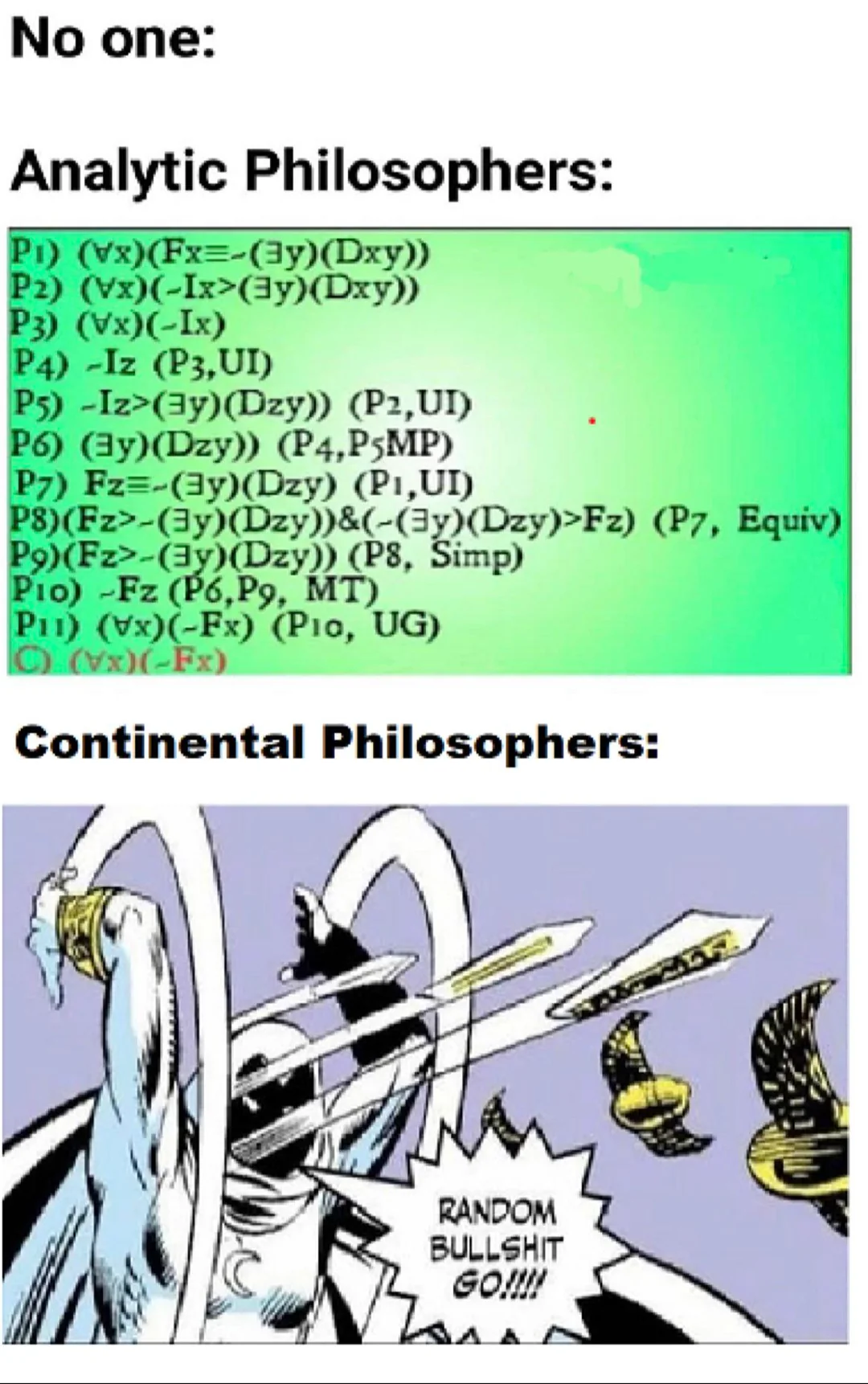 >>175705 Он континентальный философ, у них так принято. Мне больше всего понравилось как Славой Пыжик предложил на каком то канале провести дебаты с Лэндом, вкинув что тот слишком оптимистичен. Попытка щитпостнуть про оптимизм у лэнда - это прям самый палевный пример, что жижек просто вбрасывает рандомную срань чтобы забайтить на внимание аудитории, а потом накинуть говна на вентилятор, которое не развивает кликбейт. А между тем лэнд и жижек это единственные современные философы, которые на слуху.