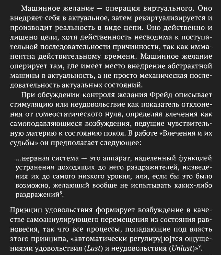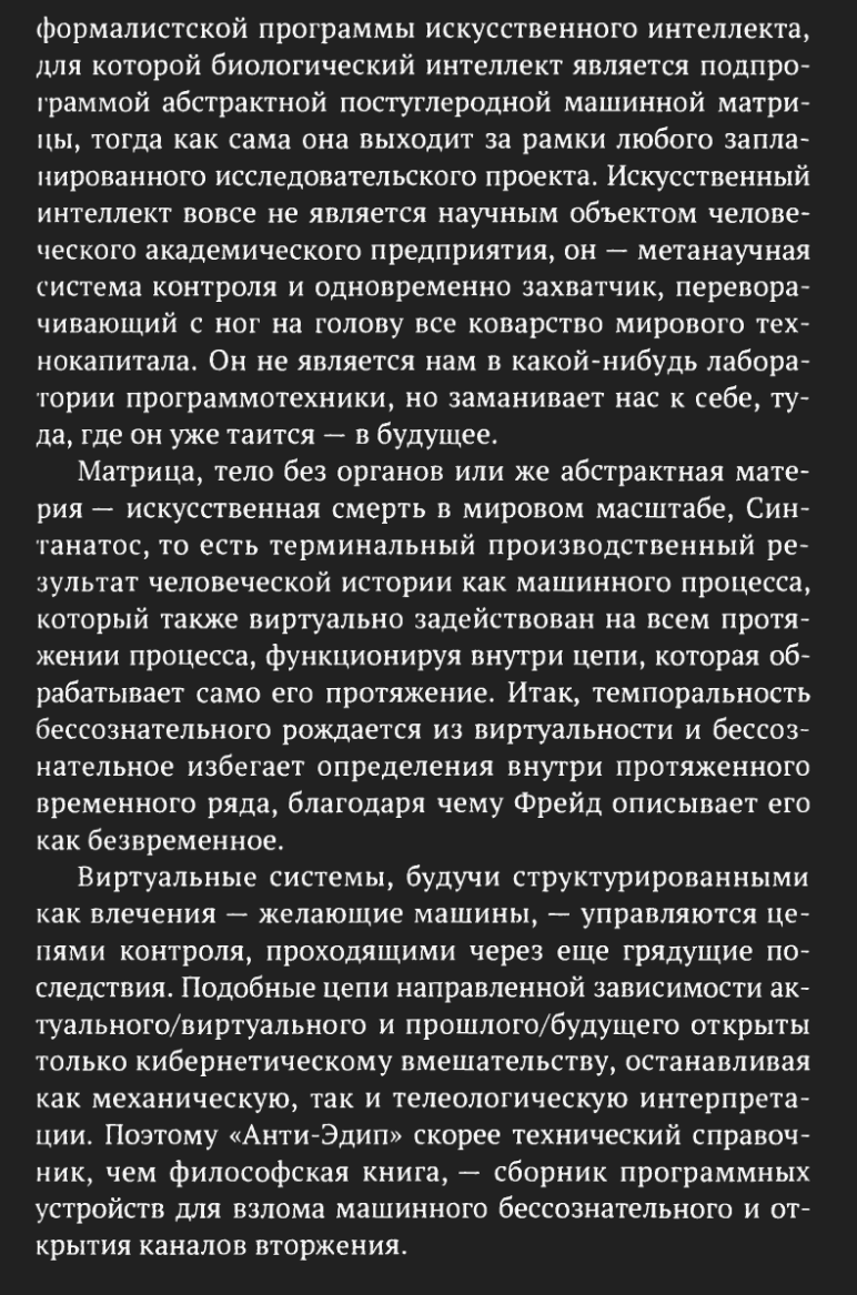 Прочитал Киберготику. Зубодробительная книга. Практически ничего не понял из его делёзо-гваттарианских и фрейдистских пассажей, буду рад, если кто-нибудь объяснит (они преимущественно в первых трёх главах). катасоникс как апогей кибернаркомании. >>157486 Вот статья, где кратко разбираются все главы из "Дух и зубы" https://spectate.ru/stolet-land/