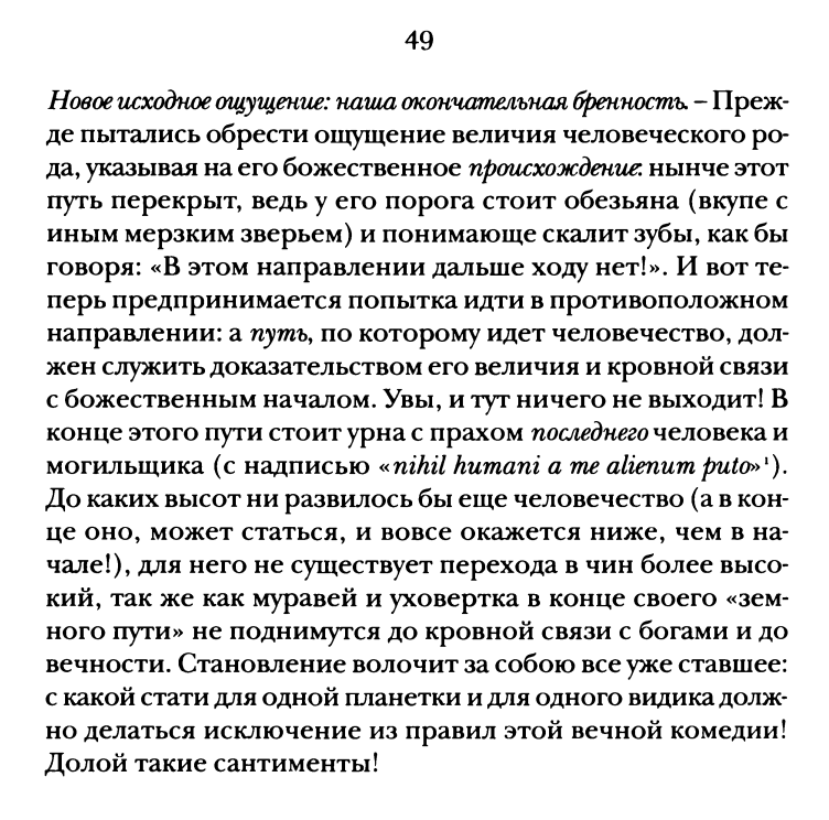>ВН 109 Остережемся вообще и повсюду предполагать нечто столь формально совершенное, как циклические движения соседних нам звезд; уже один взгляд на Млечный Путь вызывает сомнение, нет ли там более грубых и противоречивых движений, равным образом звезд с вечно-прямолинейными траекториями падения и еще чего-либо аналогичного. Астральный распорядок, в котором мы живем, есть исключение; этот распорядок и обусловленная им внушительная длительность делают возможным еще одно исключение из исключений: образование органического мира. Общий характер мира, напротив, извечно хаотичен, не в смысле недостающей необходимости, а в смысле недостающего порядка, членения, формы, красоты, мудрости и как бы там еще ни назывались все наши эстетические антропоморфизмы. Эх. Почему не "Остережемся говорить, что общий характер мира извечно хаотичен"...
