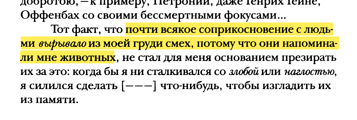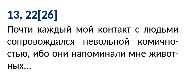 >Почти каждый контакт с людьми непроизвольно вызывал во мне образ животного Человечество всю свою историю фантазировало по поводу тех вопросов, на которые у него не было информации для ответа. Мы узнали эту тайну. Что мы ("познающие", не человечество) будем делать? Продолжать фантазировать! (ВМЕСТО того, чтобы научиться признаваться: мы не знаем.)