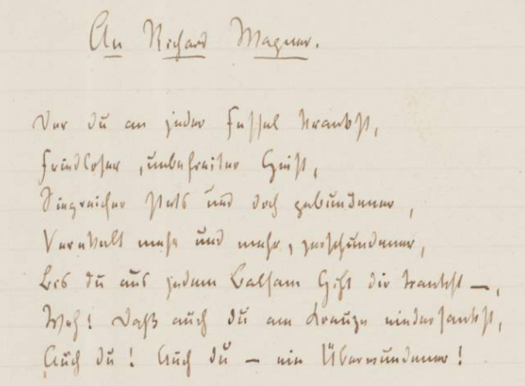 11, 28 [64] (1884) Flieg, Vogel, schnarr Dein Lied im Wüstenvogel-Ton! — Versteck, du Narr, Dein blutend Herz in Eis und Hohn!