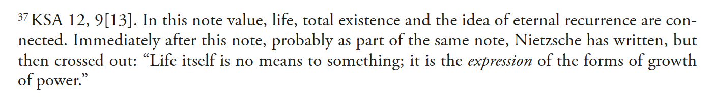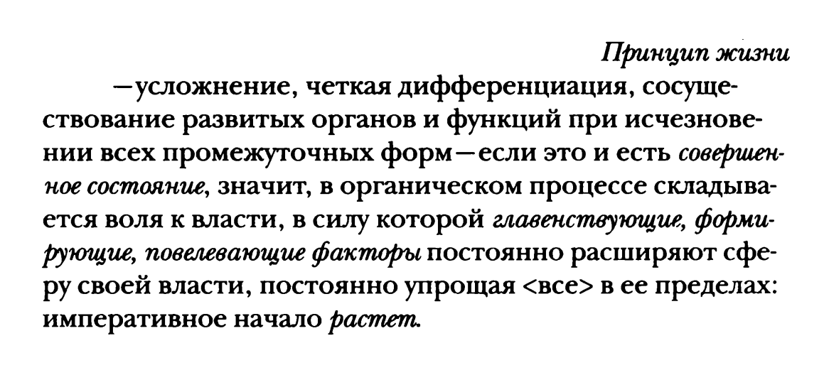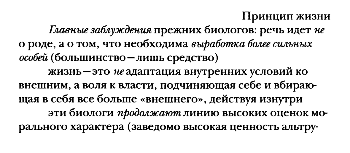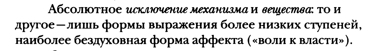 2. «В корне ложная ценностная оценка ощущающего мира по отношению к мертвому. Потому что мы являемся им! Принадлежим ему! (…) …так мы примиримся с настоящим, т.е. с мертвым миром». (9, 11 [70] 1881) «У нас нет иного представлении о том, что такое "быть", кроме как "жить". Как нечто неживое может "быть"?» (12, 2 [172] 1886)