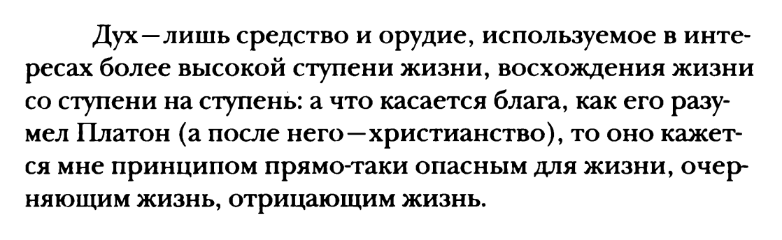 Если это верно, то появляются основания полагать, что Ницше до конца «честно» считал, что люди не живут ни для чего другого, кроме продления/умножения рода, а различные концепции разыгрывал как трагик. Это интересно в контексте особых не совсем однозначных отношений Ницше со скептицизмом (веры и безверия >>181760, «веры в неверие» и «веры в веру» и т.д.).