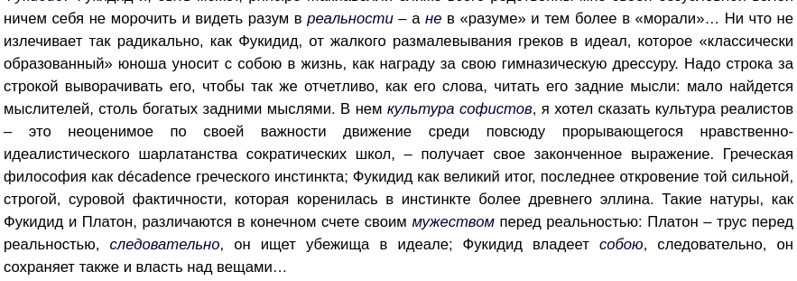 >>180520 — "The powerful exact [alt.: do] what they can, and the weak have to comply. [But no necessity is presupposed, "as such".]" — and vice versa. — ... выражаясь мягче: должно быть "слабые" не ведут "заговора" против сильных, как и сильные против слабых, - проблема в том, что не может быть иначе, - слабые говорят и делают что могут, и сильные делают то же самое: следовательно, когда слабых слишком много, условия жизни сдвигаются в силу числа/Zahl к условиям жизни для слабых - но ничего, абсолютно ничего из этого не делает их суждения о жизни, добре и зле истинными или ложными, а только "перспективальными" (GD, Anti-Darwin)... однако и те, и другие, - могут человечеству навредить (как "христиане", так и Цезари того времени (вероятно, слишком невоздержные, слишком неумеренные, не "сохраняющие власть над собой", - тем самым повлиявшие на возникновение т.н. decadence)) и в совокупности либо человечество [die Menschheit / der Mensch] уничтожить, либо низвести [niedrig] к ничему, - т.к. принцип сострадания требует возрастания слабости, а не устранения условий её возникновения/"возвращения"/wiederkehr проблема несовместимости движения направленного на улучшение условий существования для всех ("последний человек") с изменениями, направленными на развитие как таковое ("сверхчеловек"): условия существования типа "своего рода сверхчеловек" сущностно не совместимы с условиями существования, ценностям типа "последний человек" соответственно и как следствие: философия Ecce Homo (выбора условий бытия/dwelling), философия A как философия отказа от христианских ценностей, - философия максимального высвобождения (в смысле JGB-13) сущности человека, а не подчинения моральным установкам, диалектическому мышлению, вере (в идеалы, в формы религий) и т.п. (der Mensch als Typus: Ницше подчёркивает, что преследование чужих желаний, а не собственных, сделало его "декадентом", т.е. "что-то вроде калеки") потому: проблема иерархии, проблема совместимости человеческих типов (что важнее: самих людей, конкретного и естественного, а не абстрактного), проблема общего "вектора" развития событий (orientierung) как следствие преобладания тех или иных типов (проблема теоретизации более высокого типа человека, либо Rangordnung, либо и то, и другое, - с точки зрения философии (в философии Ницше не отделяет религии от, собственно, философии, - религия для Ницше (например, ислам) и есть определённая разновидность философии (например, идеологии)))