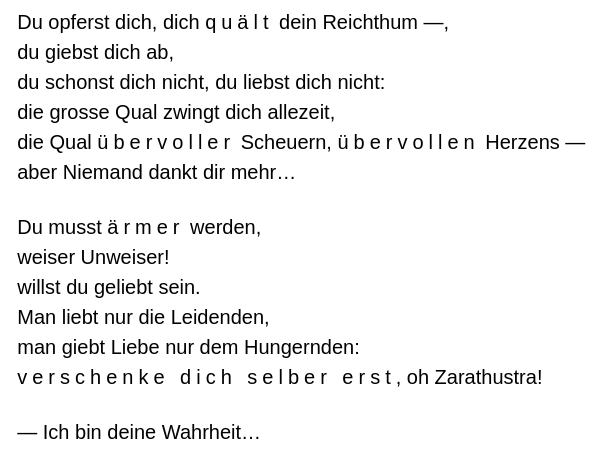 — ... Und wie ihm die Welt auseinander rollte, so rollt sie ihm wieder in Ringen zusammen, als das Werden des Guten durch das Böse, als das Werden der Zwecke aus dem Zufalle. Die Zukunft und das Fernste sei dir die Ursache deines Heute: in deinem Freunde sollst du den Übermenschen als deine Ursache lieben. ... —
