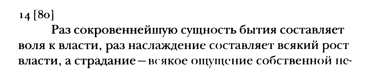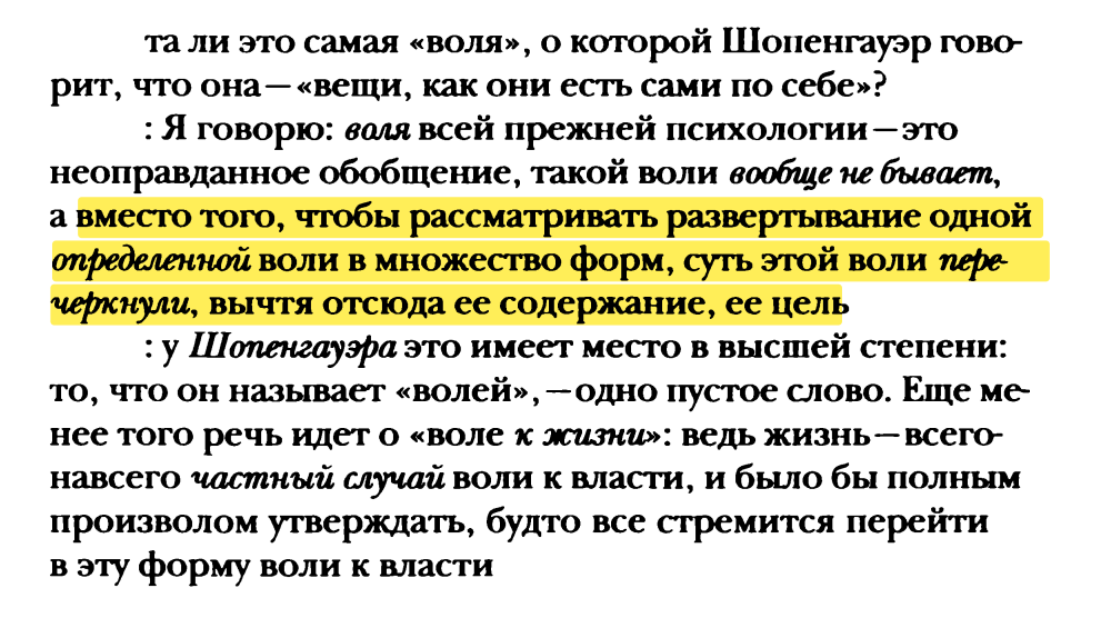 Это был первый заход. Второй заход заключается в том, что онтология Ницше, на которую он "поставил", ошибочна >>180316 →. Онтологический волюнтаризм ("воля к жизни" превратилась в "жизнь как волю к власти", все еще оставшись силой, которая будто бы движет Юпитером) — вот это стоило бы ему реально преодолеть в Шопенгауэре. И внести корректуры главным образом не в рангорднунг человеческих перспектив, или рангорднунг форм жизни (?!), а в рангорднунг универсума, субординационные отношения понятий "мир", "живое", "человек", "бытие" и др. в своих представлениях. МИР НЕ ЕСТЬ ВОЛЯ К ВЛАСТИ. Такое заявление не основывается ни на чем, кроме старых метафизических предрассудков или просто хотелок "слишком человеческого".