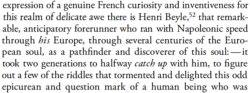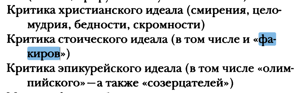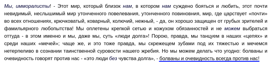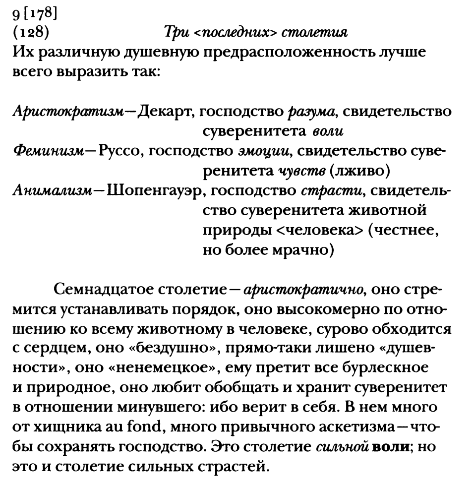 А вот если у него начинают смещаться интересы от познания куда-то в сторону "улучшения жизни" или еще чего-то подобного — тогда да. Здесь возвращаю к началу поста. Еще раз переформулирую: Ницше претендовал на то, что он интеллектуальным путем пришел к отрицанию, превосхождению "страсти к познанию". На мой взгляд, это неправда; он пришел таким же путем, каким бы например человек, которому отрезало трамваем ноги, решил перестать быть футболистом (он может даже написать книгу "почему футболисты должны переставать быть футболистами и становиться идеологами"). Не имею в виду, что Ницше отрезало философские ноги, имею в виду, что здесь была перемена в совсем другой области (какая — даже неважно). Если это какая-то аргументативно весомая причина, связанная с рангорднунгом перспектив, то я ее не встречал, а голословно и я могу сказать, что Freigeist это вершина перспективной пирамиды. Сам Ницше к этому приводит достаточно аргументов в книгах 87-88 гг., выше цитаты про скептиков (>>180284 →)