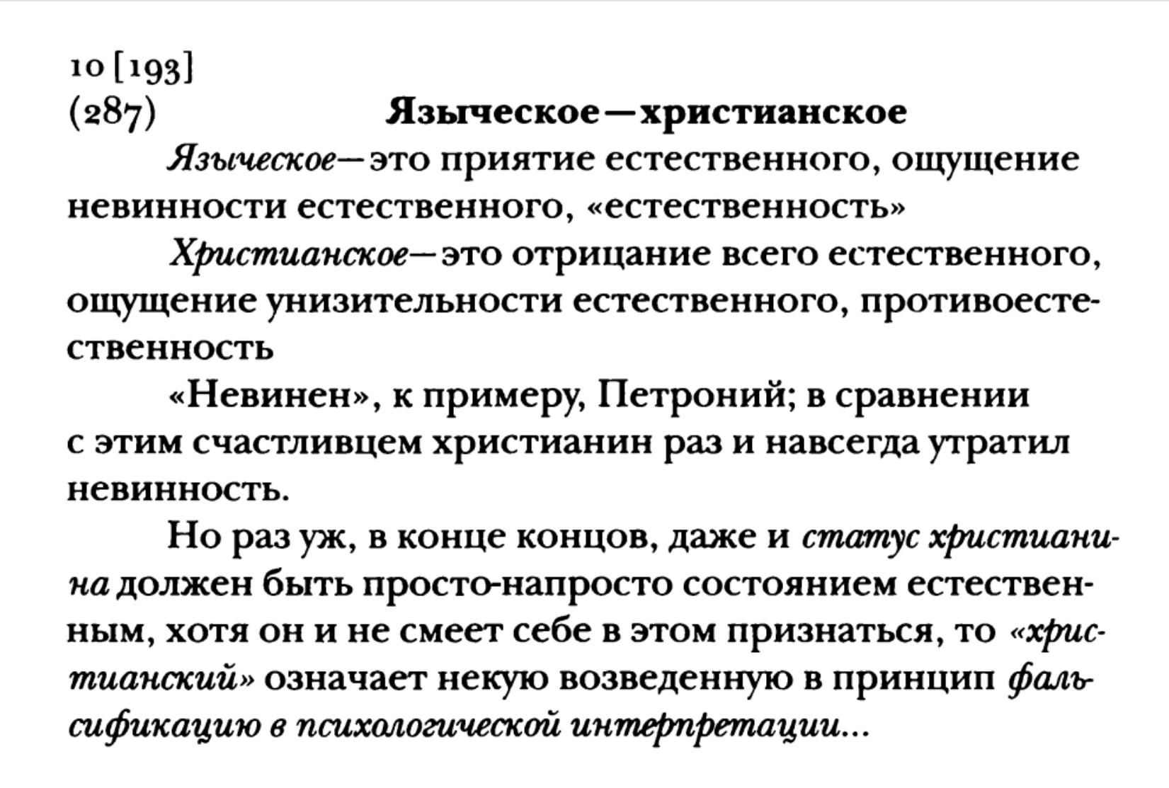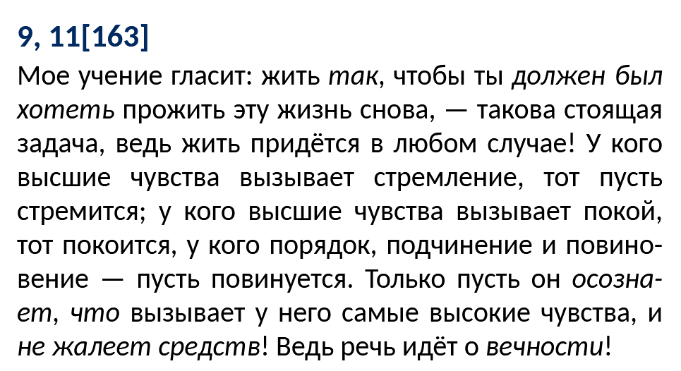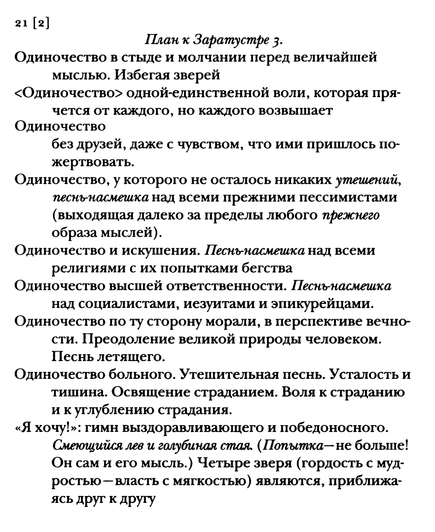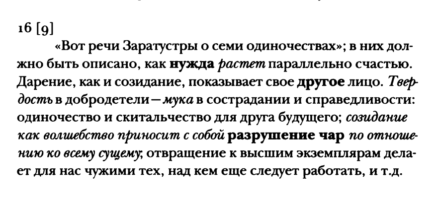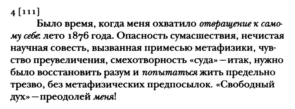 ВН 309 (1882) Из седьмого одиночества. Однажды странник захлопнул за собою дверь, остановился и начал плакать. Потом он сказал: “Этот сыр-бор вокруг истинного, действительного, немнимого, достоверного! Как я зол на него! Отчего меня погоняет как раз этот мрачный и пылкий погонщик! Мне хотелось бы отдохнуть, но он не дает мне этого. Что только не соблазняет меня остановиться! Повсюду раскинулись сады Армиды: и, значит, все новые разрывы и новые горечи сердца! Я должен дальше влачить ноги, эти усталые, израненные ноги; и, поскольку мне приходится делать это, часто я угрюмо озираюсь на прекраснейшее, не смогшее меня удержать — оттого именно, что оно не смогло меня удержать!”