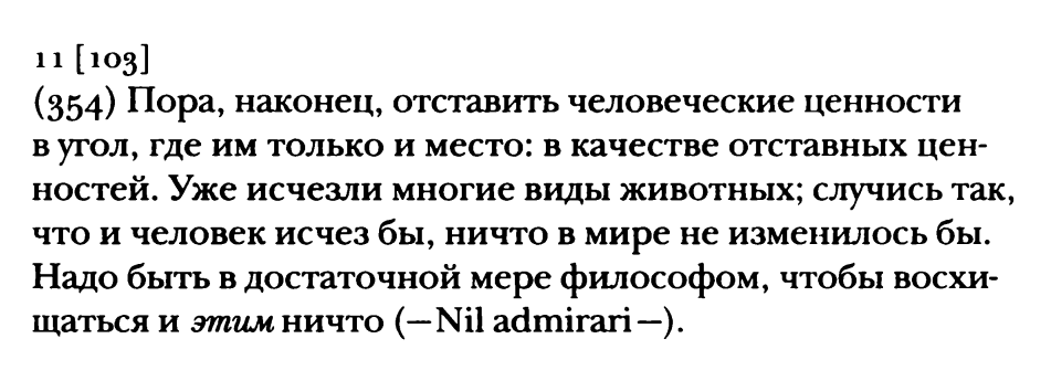 9, 11[10] Желание познать вещи такими, какие они есть, — только это является добрым устремлением, а не внимание к другим, не взгляд чужими глазами, что было бы всего лишь переменой места эгоистичного видения! Мы хотим исцелиться от великого безумия, все измеряющего нашей мерой (…) Умножение безразличия! И упражняться в умении смотреть другими глазами — исключая человеческие отношения, то есть смотреть фактически! Лечить человека от мании величия! Откуда оно? Из страха: вся умственная сила всегда должна была быстро возвращаться к личному взгляду. А это уже животное страдание. Противоположность высшего эгоизма — отнюдь не любовь к другому!! А нейтральный, фактический взгляд! Страсть к «истинному» вопреки всем личностным соображениям, вопреки всему «приятному» и неприятному есть высшая страсть — а потому встречается пока крайне редко!