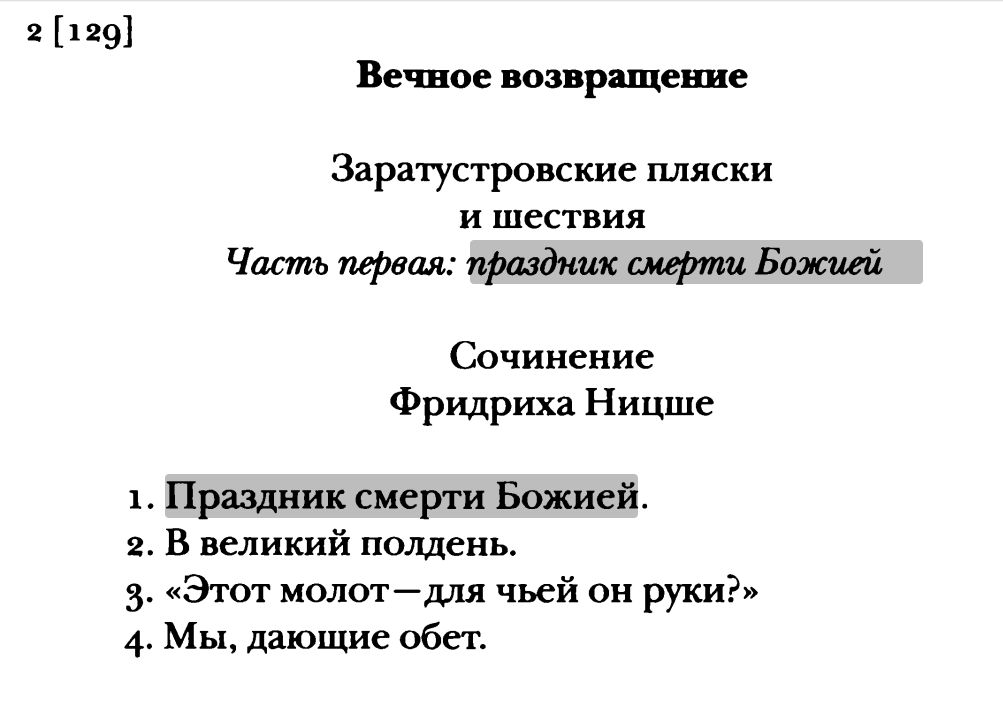 Ибо четвертая книга ВН заканчивается параграфом, подписанным как «Incipit tragoedia» и содержащим начало будущего «Заратустры». А предпоследний параграф выражает впервые идею вечного возвращения, которая, по Ницше, как «мысль тысячелетия» должна оказать огромное влияние на мироощущение людей (кого-то преобразить, кого-то убить).