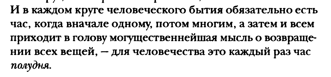 Тж. на самом деле описание "эры вечного возвращения", наступающей в великий полдень, само по себе может выглядеть как будущая утопия, которую нужно строить. Хотя на самом деле и это напоминает философию сверххиппи... (новая эра, водолея) А еще это немного выглядит как самопротиворечие — как вечное возвращение может предполагать движение к утопии... Или это в основе концепции так и задумано, историософская доктрина, которая предполагает вечно обнуляющийся мир, постепенно приходящий к самоосознанию вечного возвращения и бесконечно это заново познающий? 9,11[148] Но противоречивость здесь заключается в том, что непонятно зачем мне приближать какую-то утопию, когда смысл фил. сверххиппи в том, чтобы мне жить здесь и сейчас