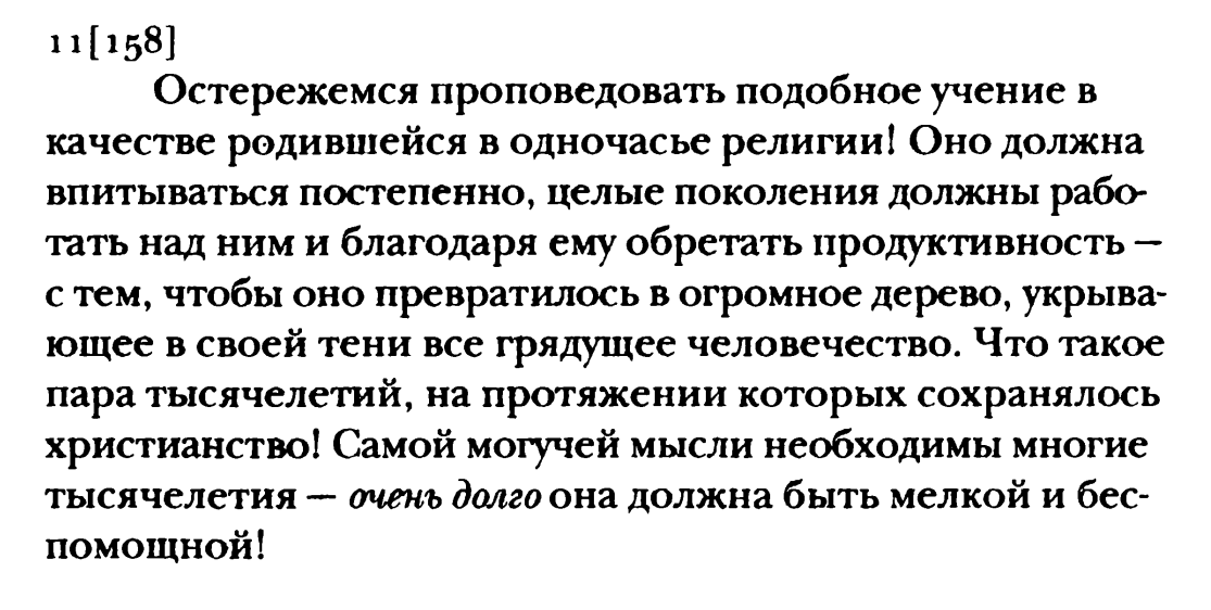 9, 11 [228] По большому счету мы почти не защищены: в любой момент какая-нибудь комета может разнести вдребезги солнце или появится некая электрическая сила, которая в одночасье расплавит звездную систему. Что значит «статистика» в подобных вещах! Земле и Солнцу всего каких-то пара миллионов лет, и пусть за это время ничего подобного не произошло — это ничего не доказывает. — Чтобы оприродить человека, требуется готовность к совершенно неожиданным и перечеркивающим все событиям. (Напомню читателю, что современные учоные считают что вселенной 13,8 млрд лет, а Земле&Солнцу 4.6 млрд) (кстати в принципе Ницше мог бы допустить "возникновение" вселенной, потому что его доктрина повторения на самом деле необходимо требует если не точку начала и конца, то точно продолжительность "цикла". Если всё повторяется в том же порядке как происходит, то в какой-то момент цикл должен повернуться (верней между двумя повторениями проходит определенное конечное время), и может быть даже должно быть можно точно высчитать длительность.. только кто будет высчитывать.. а может можно этот цикл перезапустить? и это и будет концом и началом. Я вижу всего две возможности: или вселенная каким-то очень странным образом "бесшовно" замыкается концом в начало, без явного события, либо концепция вечного возвращения строго не сочетается с типично понимаемой вечной вселенной. Вселенная вечного возвращения как раз не вечна а имеет начало и конец! Только после конца снова начало. Но конец и начало логически необходимы, чтобы было повторение (либо странная бесшовность, которую механистически с цепями причин и следствий представить наверное нельзя))