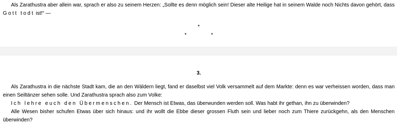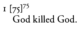 "Die in schwer lesbarer Handschrift verfasste vorletzte Aufzeichnung der Hefte bestimmt das "Denken" als "ein unhörbares Gespräch mit den entflohenen Göttern"." — Hungernd, gewaltthätig, einsam, gottlos: so will sich selber der Löwen-Wille. Frei von dem Glück der Knechte, erlöst von Göttern und Anbetungen, furchtlos und fürchterlich, gross und einsam: so ist der Wille des Wahrhaftigen. — habt klügere Hände, greift nach tieferem Glücke, nach tieferem Unglücke, greift nach irgend einem Gotte, greift nicht nach mir: — mein Unglück, mein Glück ist tief, du wunderlicher Tag, aber doch bin ich kein Gott, keine Gottes-Hölle: tief ist ihr Weh.