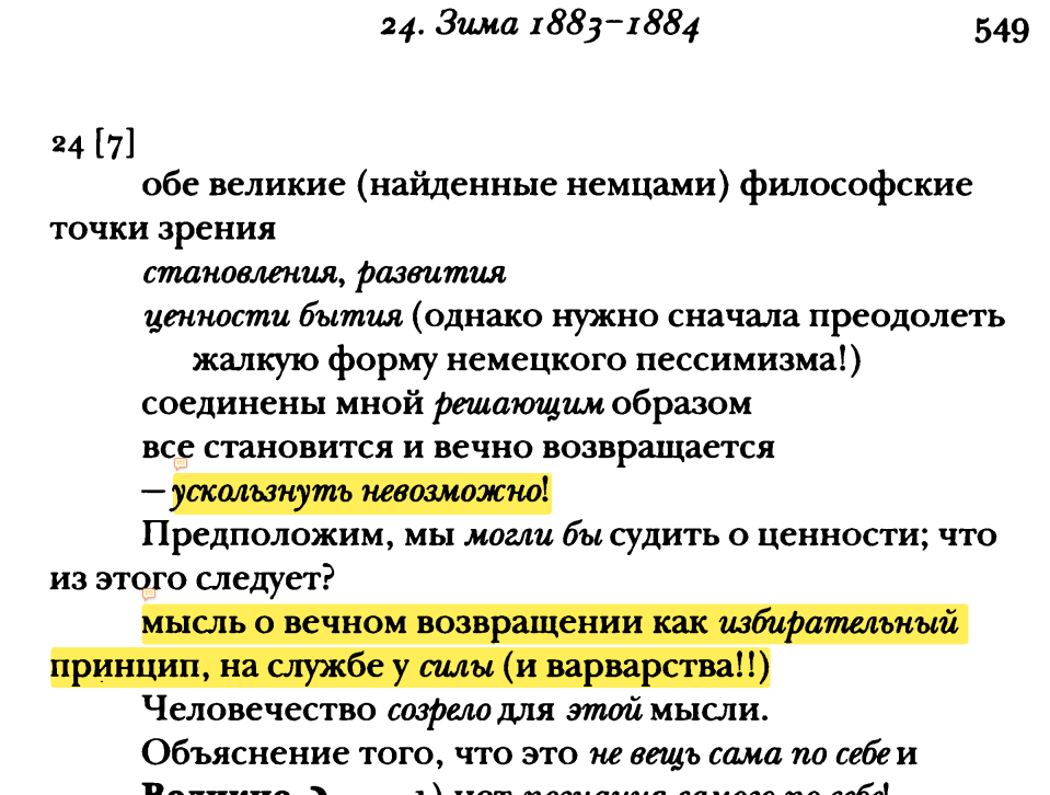 К этим вещам относятся Господа Земли + Добрые Европейцы (насколько "Господ Земли" >>181313 игнорируют/не знают! Хотя они вынесены отдельным параграфом в ВкВ, и в KSA больше, чем в ВкВ; и часть есть в ПТСДЗ, и намеки в произведениях до конца. "Причины одиночества" - ультрарадикальные политические взгляды, которые нельзя даже выразить публично; даже сегодня!), а также еще и Вечное возвращение, понимаемое как live for today (оно по-видимому таким и было в 1881, пик 4). Кстати, это >>181149 ведь философия "настоящего Иисуса". Кириллов >>181180>>181180 Страстный утопизм, вера в революционно другое будущее также сочетается с бездетностью